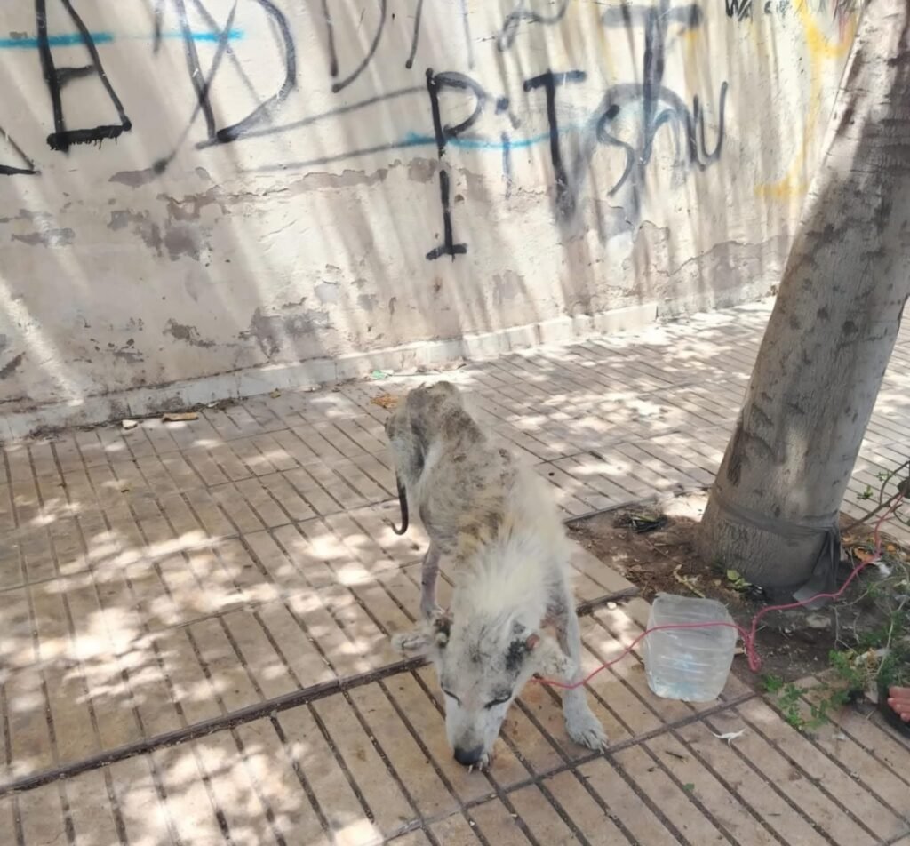 Trouvée très maigre, atteinte d’une gale purulente et avec la patte arrière sectionnée, elle se battait simplement pour survivre. Malgré l’absence de véhicule ce jour-là, l’équipe de l’UMPA a mobilisé toutes ses forces pour aller la récupérer et l’emmener en urgence à la clinique.